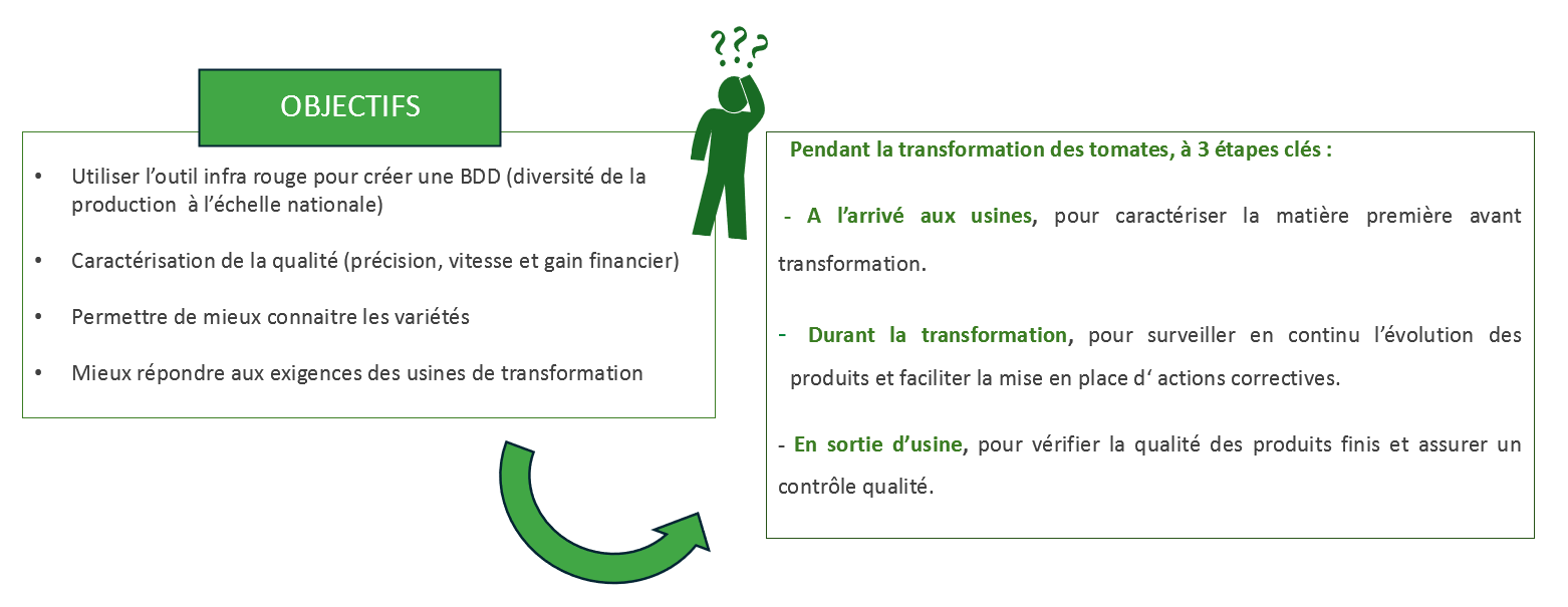 Tout d’abord, l’utilisation de la spectroscopie infrarouge doit permettre de former une base de données spectrale. Cette base de données a pour but de faciliter la caractérisation des différentes variétés de tomates destinées à la transformation.